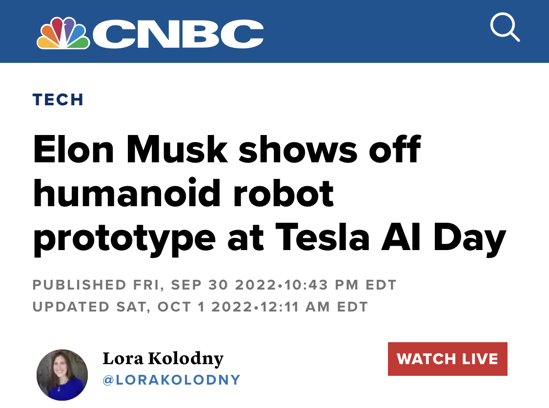 1. 테슬라 AI Day에서 휴머노이드 로봇 프로토타입을 선보임. 지난 21년 8월에는 프로토타입도 없어 레오타드 입은 마네킹 보여준 것에 비해 대단한 발전