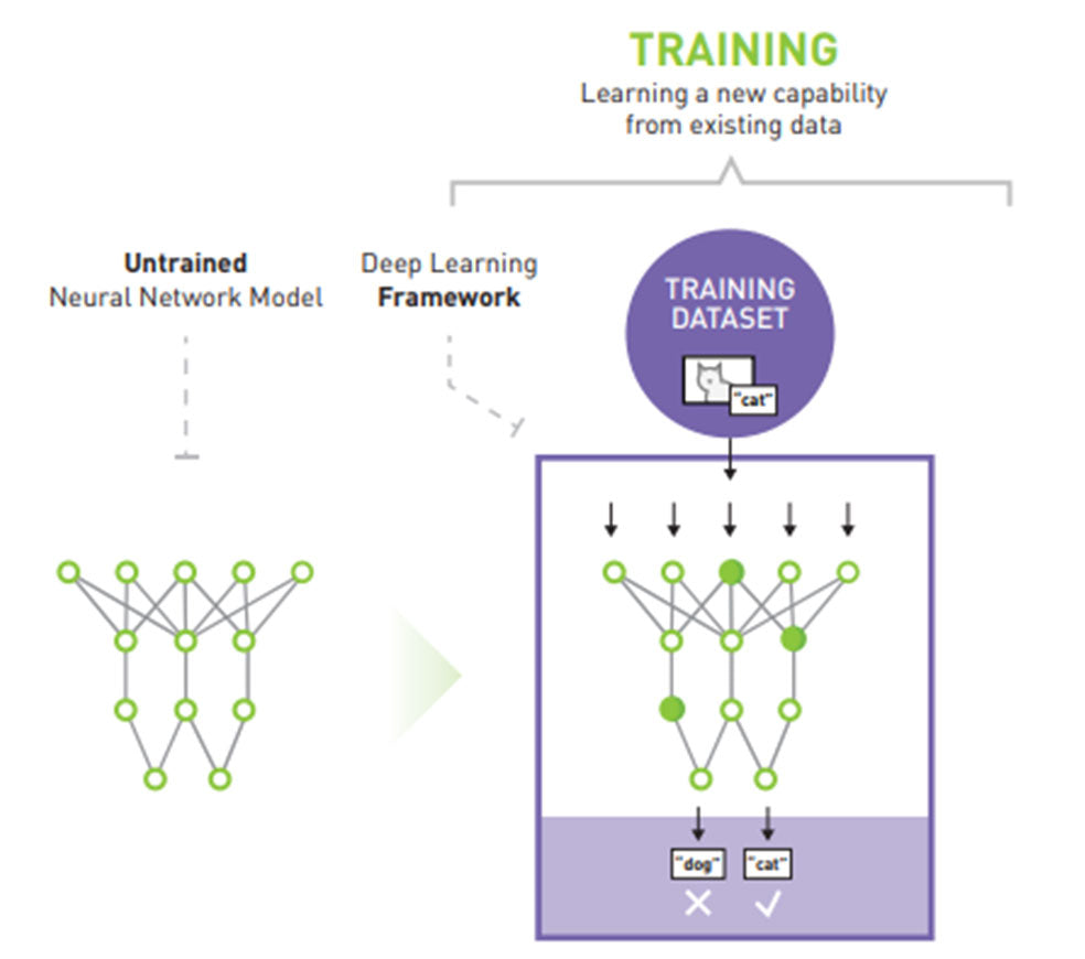large sets of data는 훈련되지 않은 Neural Network으로 계산되며, 과정 중에 각 레이어의 가중치(weight)를 조정하여 데이터의 중요한 지표(feature)를 인식함